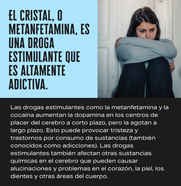 Los estimulantes como la metanfetamina funcionan diciéndole al cerebro que suelte mucha dopamina, un químico que puede hacerte sentir feliz a corto plazo. Pero con el tiempo, la metanfetamina puede agotar el cerebro en áreas importantes que te hacen sentir bien, lo que con el tiempo resulta en depresión y mal humor. La metanfetamina también puede causar problemas cardíacos inmediatamente y otros problemas de salud a través de sus efectos estimulantes en el cuerpo y estos pueden poner en peligro tu vida.